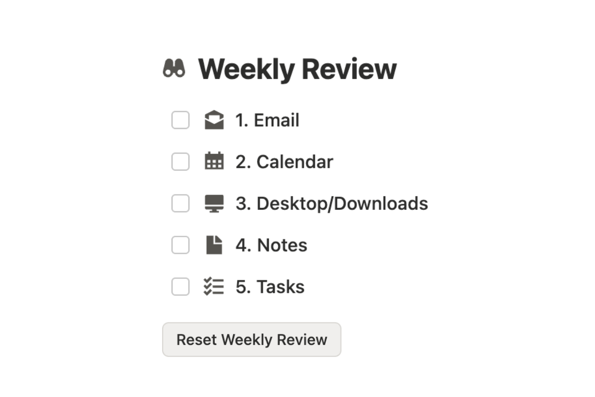Reset, reflect, and plan for the week ahead. Your Weekly Review, made simple. This is the ritual that keeps your entire system humming.